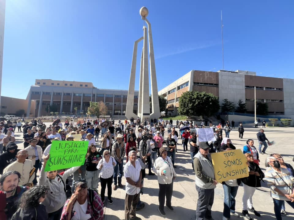 Portando pancartas, los manifestantes comenzaron la protesta alrededor de las 10:00 de la mañana en la explanada del Centro de Gobierno de la capital estatal. Posteriormente, se dirigieron hacia el interior del recinto, donde corearon consignas como “Justicia para Sunshine” y “Fuera Marina del Pilar”.