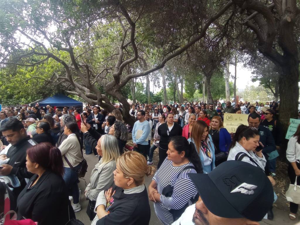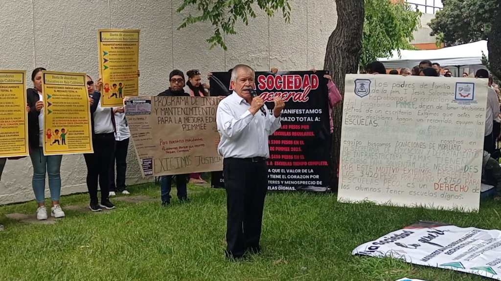 Docentes, madres y padres de familia, directivos y supervisores escolares se manifestaron este lunes en las instalaciones del Sistema Educativo Estatal de Tijuana para exigir la restitución del presupuesto del Programa de Insumos y Mantenimiento para el Mejoramiento del Entorno Educativo (PIMMEE), que este 2025 sufrió una drástica reducción.